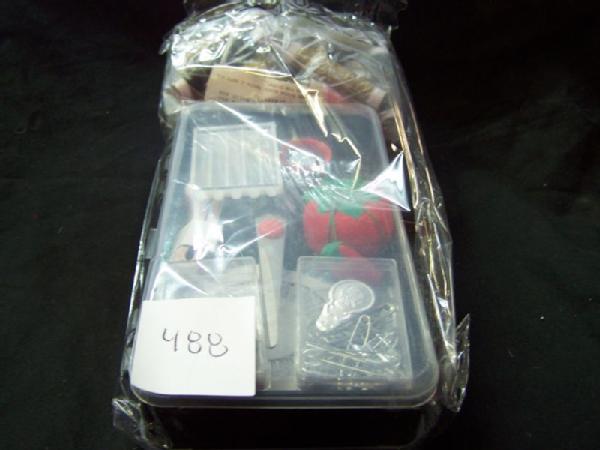 Complete sewing kit with needles, pins, measuring tape, thimble scissors, thread, pin cushion. Plus 32 free spools of thread
